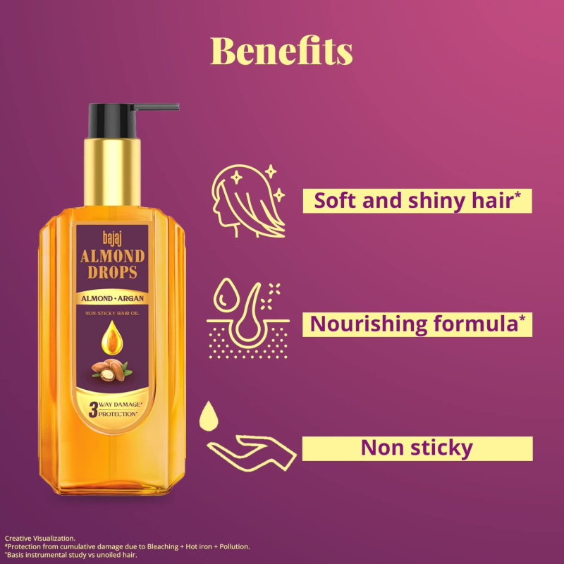 Bajaj Almond Drops Almond + Argan oil protects the hair against cumulative damage from Chemical treatments, Heat styling and Pollution