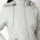 Jacket with faux fur trim, has a mock collar with hooded, 2 pockets ,has a snap button closure, sleeveless, straight hemline, polyester lining